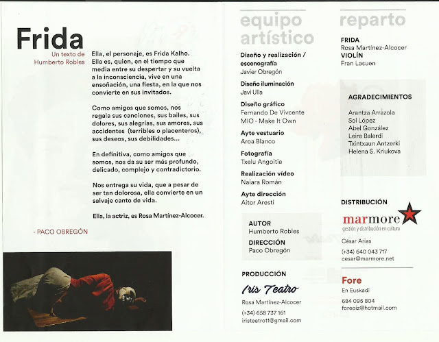 Compañeros he vuelto a ir al teatro, en este caso una obra que me ha emocionado, sabía algo de este personaje pero, nunca me lo imaginé en una obra de teatro. La obra es Frida y es interpretada por una actriz de Eibar y hace un monólogo maravilloso y con una interpretación sublime. La actriz que la interpreta en Rosa Martinez-Alcocer. Al leer el catálogo de la obra me interesó y decidí que hoy no iba a pintar, quería ver esta obra. Me sonaba el apellido y envié un wassap a mi compañera Mª Jesús y le pregunté si su hermana era la actriz y hacia esta obra. Me dijo que sí, así que enseguida me encontré con ella y unas compañeras más y fuimos al teatro a disfrutar del monólogo. Y amigos, me ha encantado a pesar de que durante más de una hora esta actriz llenaba ella sóla el escenario. Le acompañaba otro eibarrés Fran Lasuen con la música del violín. La asistencia fue casi lleno, y los aplausos al acabar la obra fue apoteósico. Esta actriz tiene tablas, tiene que triunfar, es una artista como la copa de un pino en la interpretación.